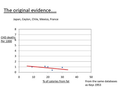 Here’s a cleaned up version of the above graph; note the 7 countries that Keys used. When I think of those countries’ diets, I would basically rank them from healthiest to least healthy, and that’s how they’re arranged on the graph (that’s Japan at the bottom left on up to USA at the top right). Keys hypothesis fits his data, based on this small (and extremely selective) sample size.