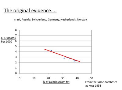 That looks really neat and orderly, and definitely shows a positive correlation. This, in fact, was the graph that Keys presented to the world and this is the very reason we’ve all been taught to think that fats are bad because fats make you fat; and in this society we’re taught that fat people are bad, and we (should) know that that’s just not true. I’ll save fat-shaming for another post someday; but if you do that kind of thing to other human beings then shame on you.