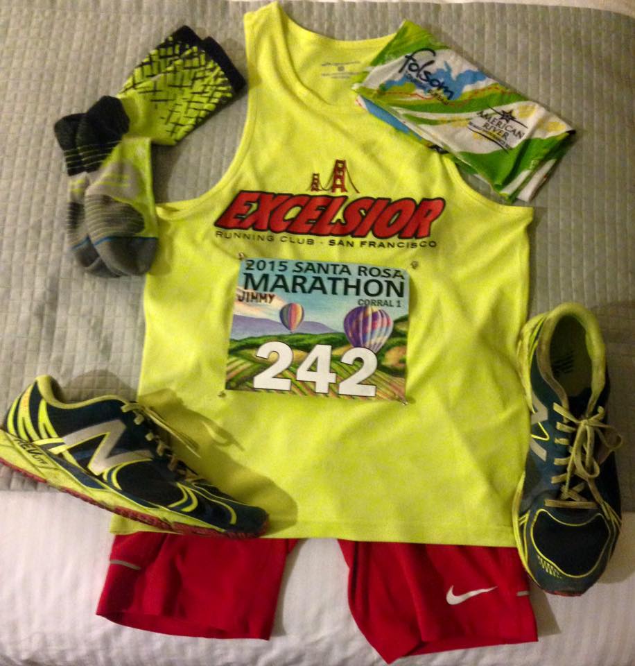 Woke up at 3:30 am (about 4 minutes before my alarm, just shot right up wide awake and ready to go), made coffee, watched some World Championship races (I think men’s 800 meters heats). Left for downtown Santa Rosa about 5 am, got to the start about 5:15, did a quick shakeout jog with Lucas, lubed up heavily (Lucas is a taper so we got band-aids from the medical tent) then checked our bags, got into our corral (#1) and tried to stay loose and let the nerves flow out of me, then GO! Race starts at 6 am.