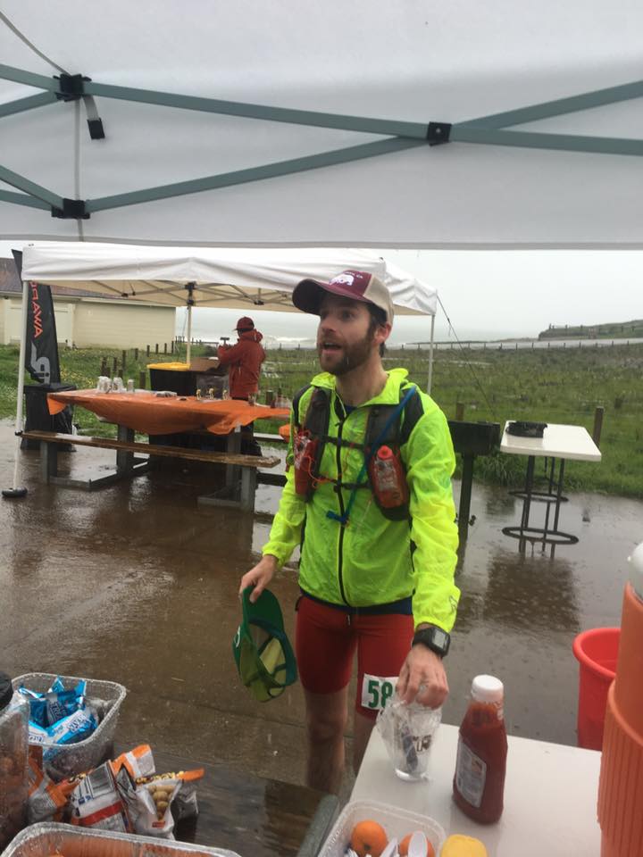But that’s the thing about rain- there’s so many different kinds of rain. There’s the light mist of rain; that’s what we got early morning. Then there’s pleasant drizzle as the morning went on, the kind that gets you “barely wet” and makes it look like crystal dew drops on everything. Then there’s sideways rain, pelting you like hail, coming out of the wind on top of Dias Ridge, miles 37 & 38. Then there’s the drenching, holy shit I can’t see five feet in front of me torrential downpour rain; on “Wile E. Trail”- this unnamed single track between Middle Green Gulch and Miwok Cutoff- probably named “Coyote Ridge Cutoff” says Inside Trail RD Tim Stahler, per course designer Jim Vernon. Get it? Wile E. Coyote. Coyote Ridge. Just go with it people, it works.